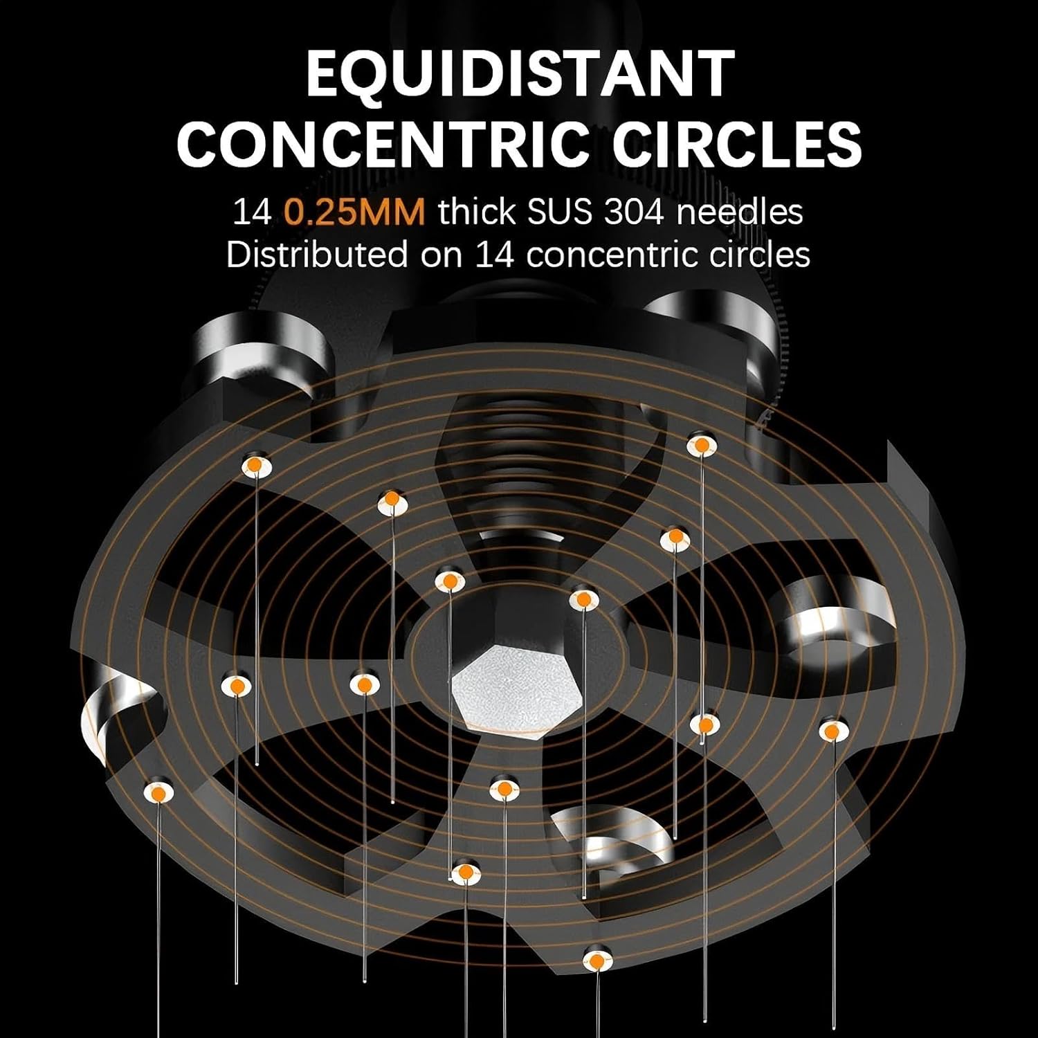 - Precision Engineering: Features 14 ultra-fine 0.25mm 304 stainless steel needles. Arranged in 14 concentric circles for even distribution. 2.2mm spacing between tracks covers 55mm diameter range.