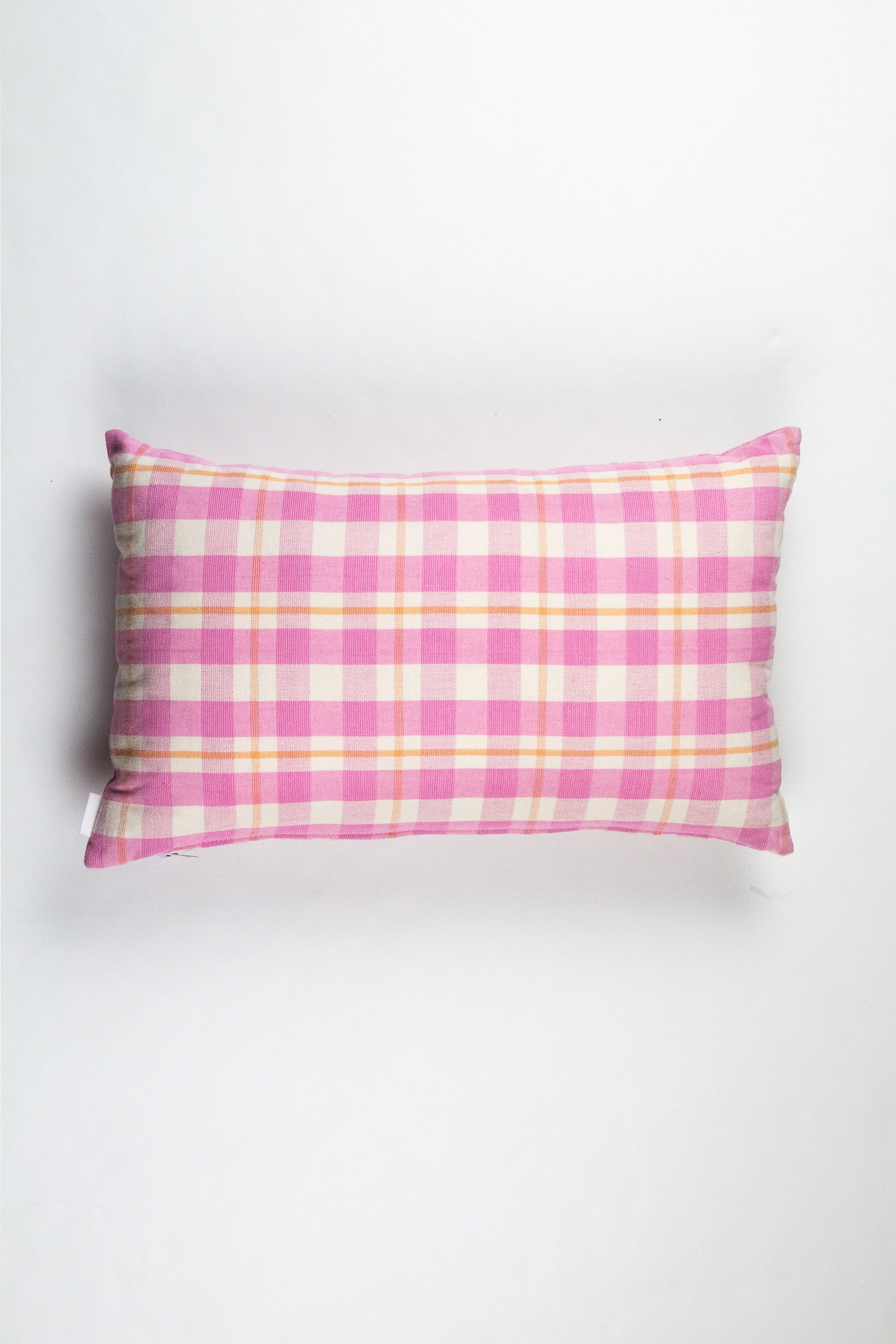 The Abigail plaid pillow is the perfect accent to add soft color and texture to any sofa, bedroom or accent chair. Stripes of bubblegum with peach accent are woven together to create this brilliantly colorful piece. Ethically handwoven by artisans in Xela, Guatemala.