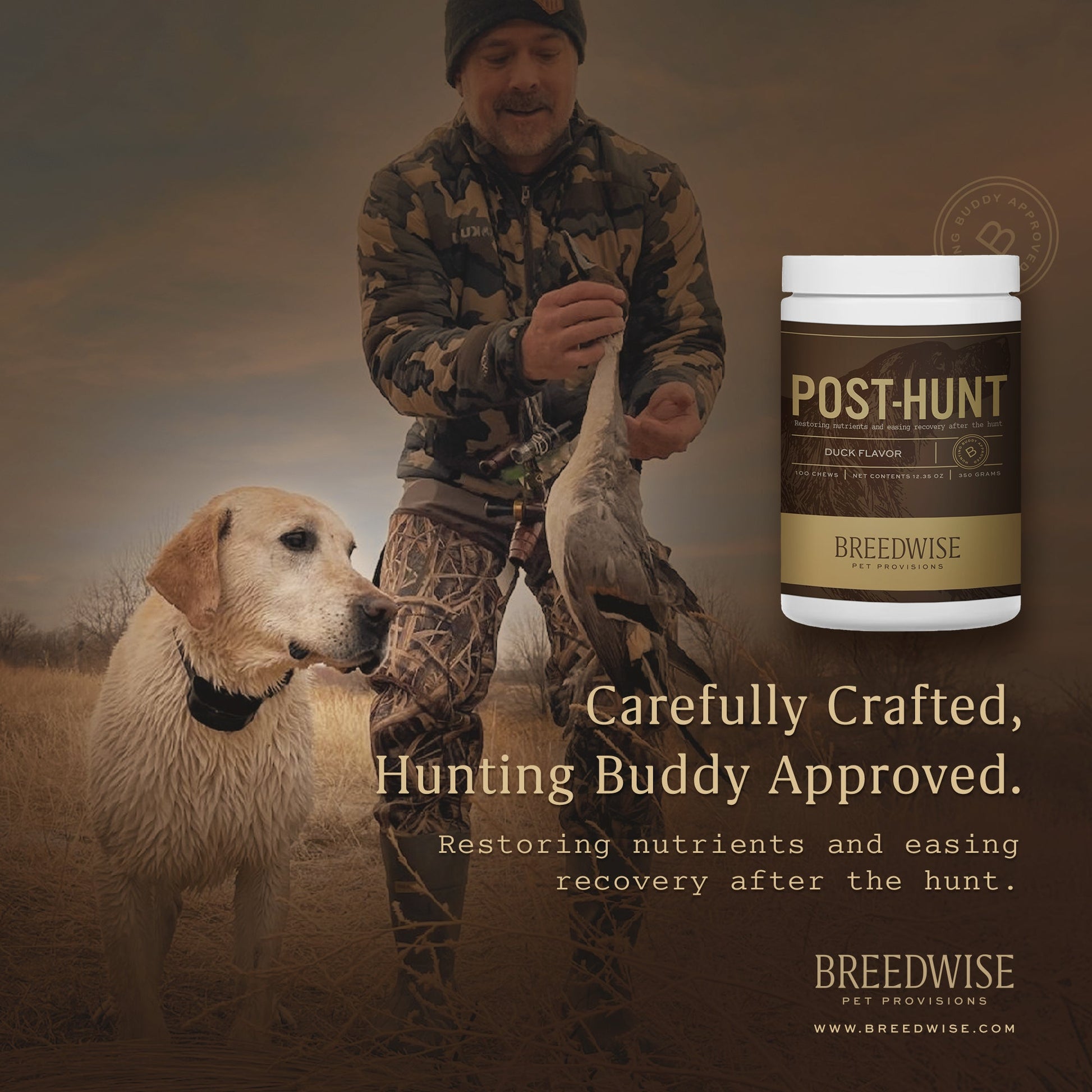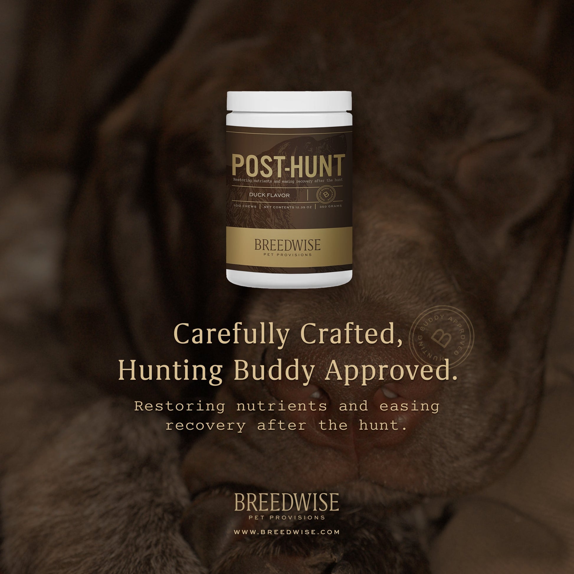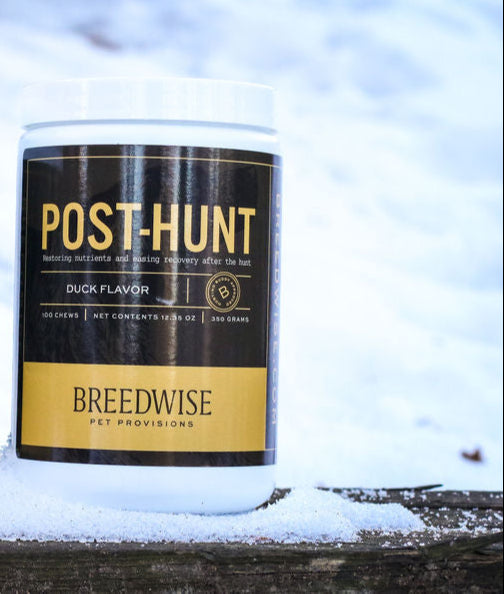 Breedwise Post-Hunt Soft Chews are specifically formulated to help sporting dogs with muscle recovery, electrolyte balance, and energy levels following strenuous outdoor activity!