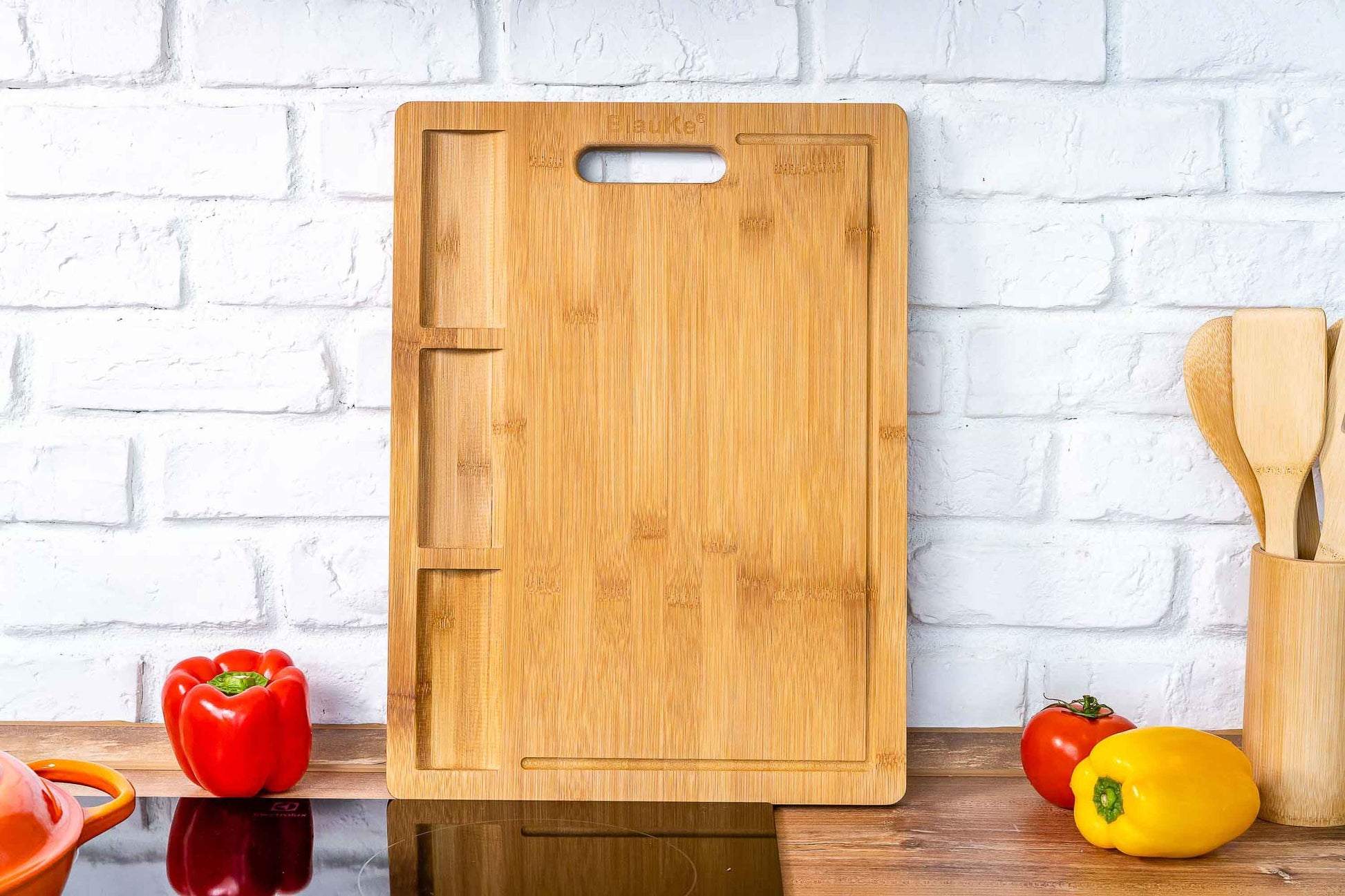 - Our extra large cutting board has a deep juice groove to prevent leaking on the countertop, 3 built-in compartments to separate foods, and a side handle to easily move around and store.