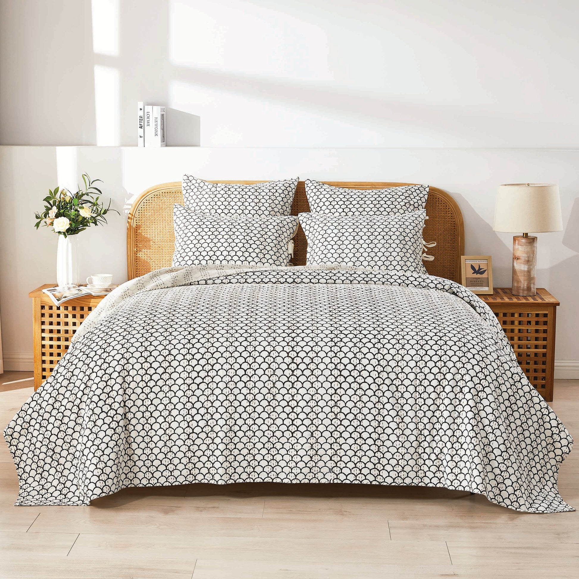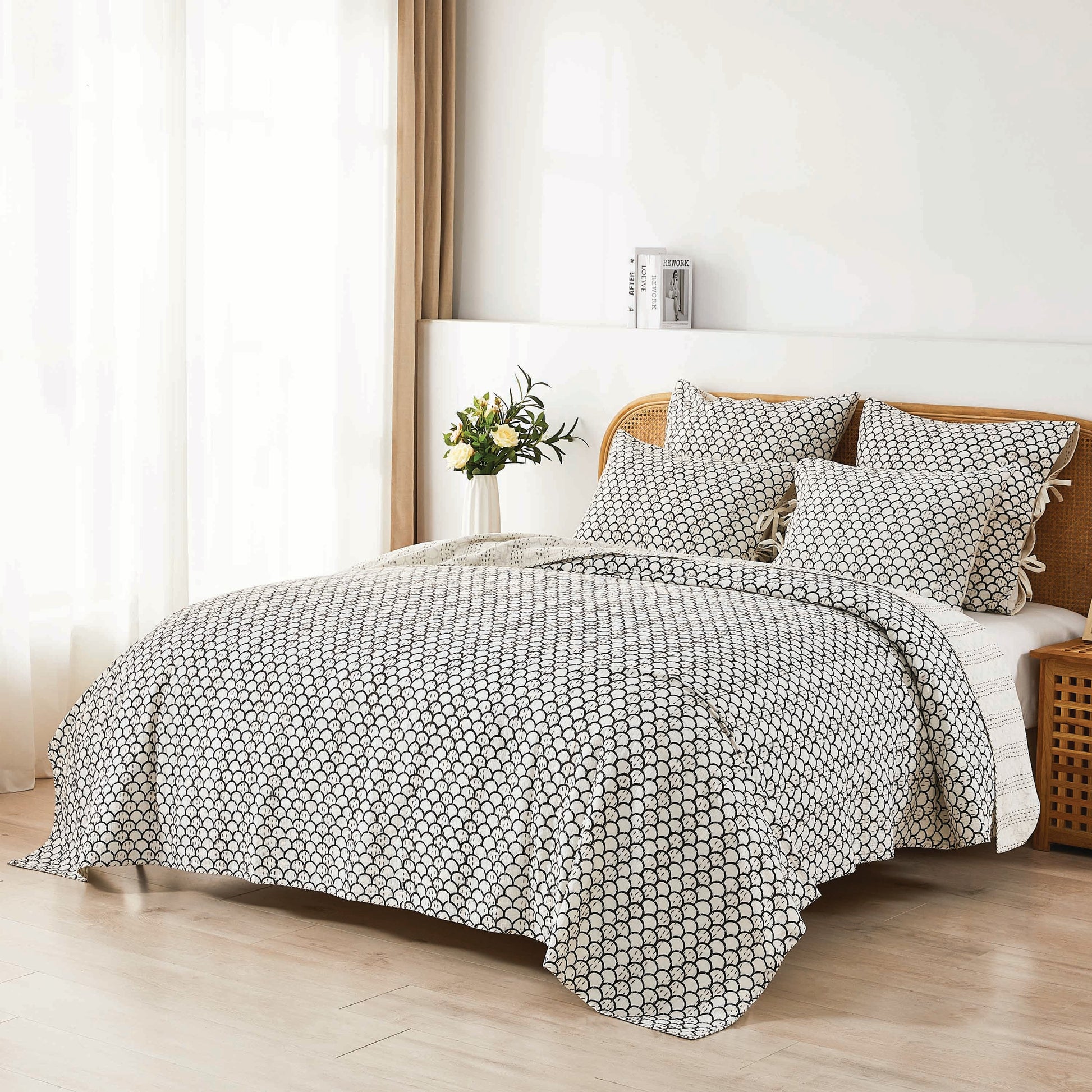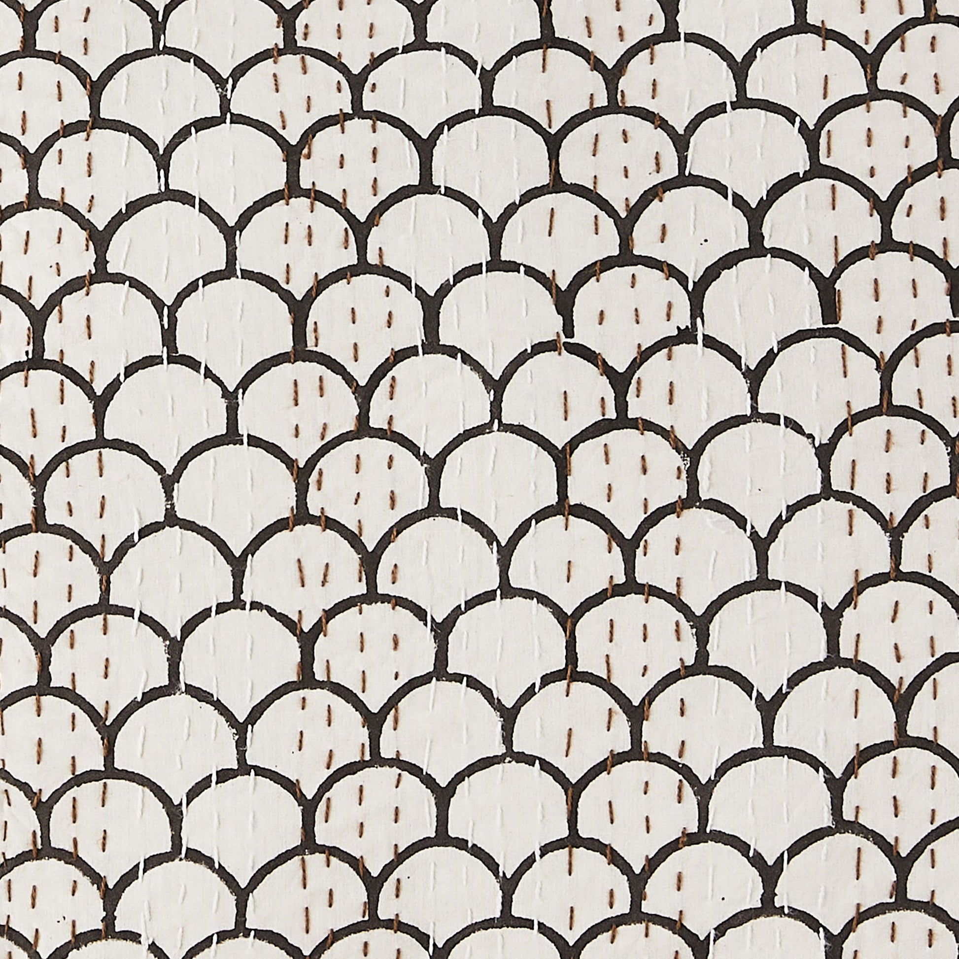 Our handmade coverlet features traditional Indian block prints. The cotton fabric is stitched by hand to create a unique, lightweight layer. Due to the handmade nature of this coverlet, variations will occur in the printing and stitching.