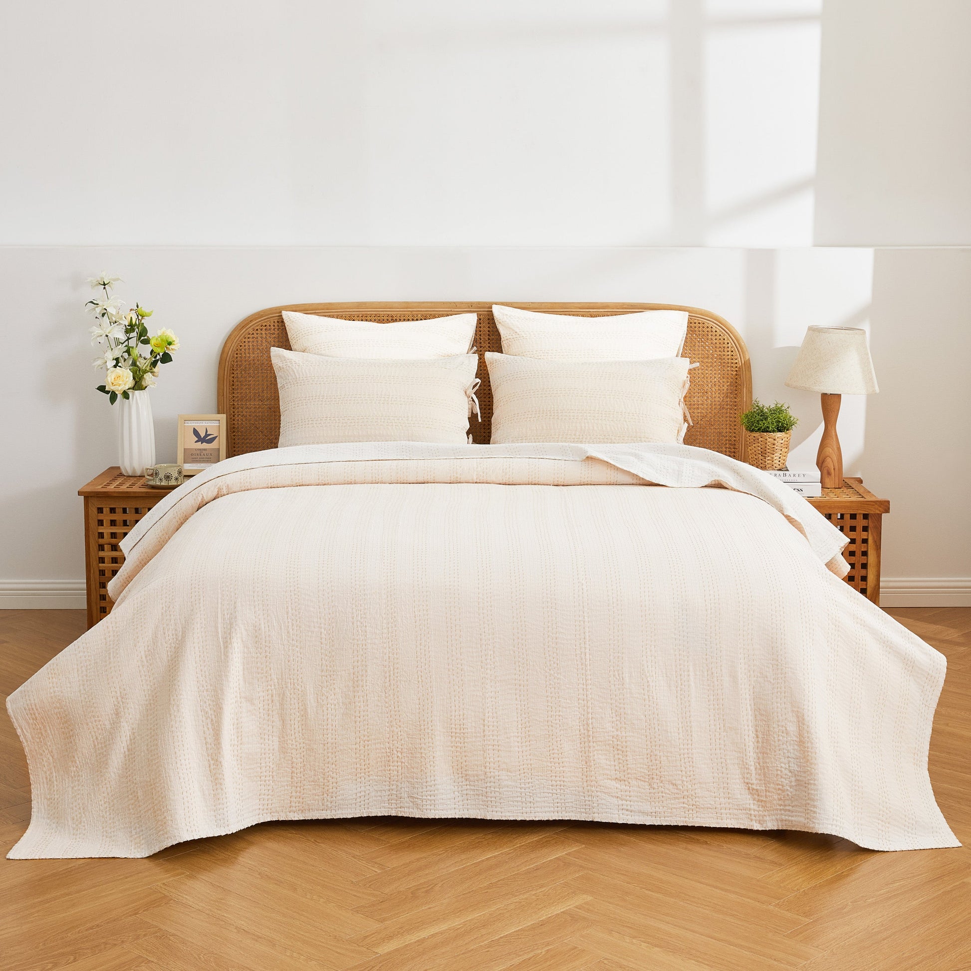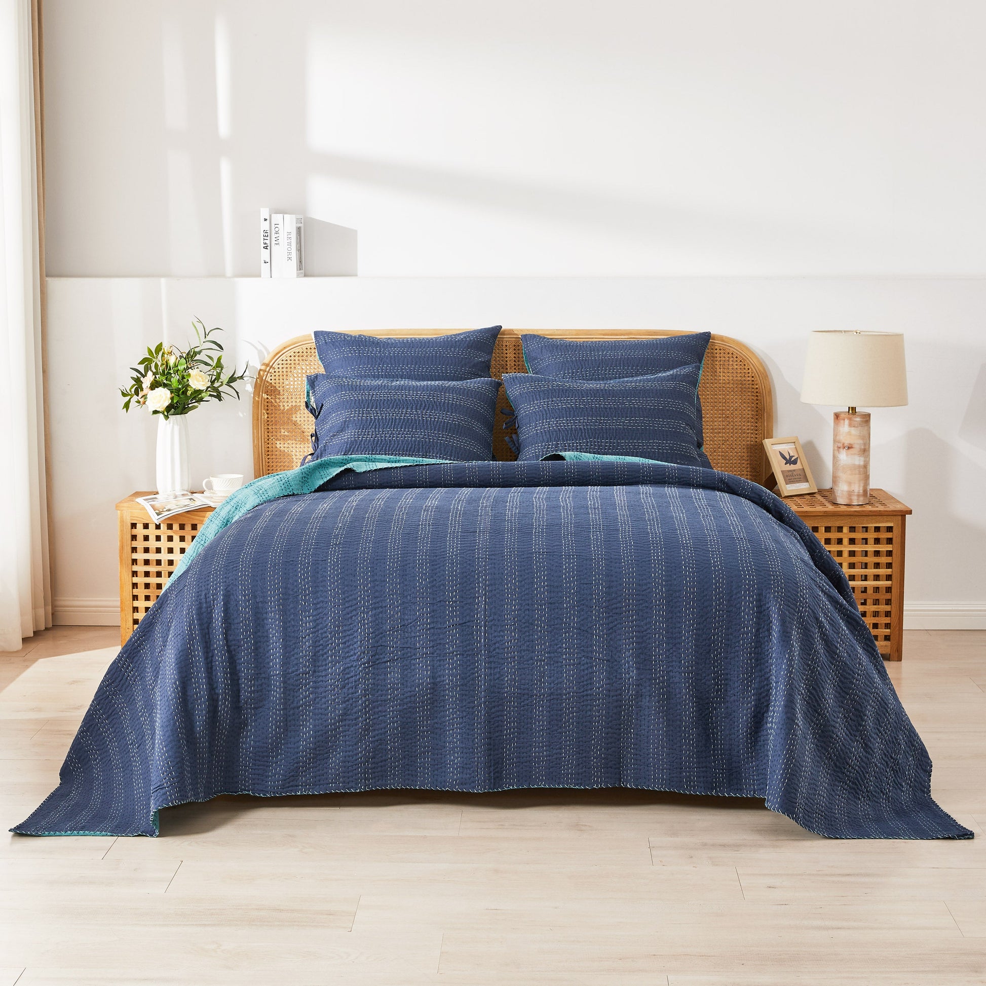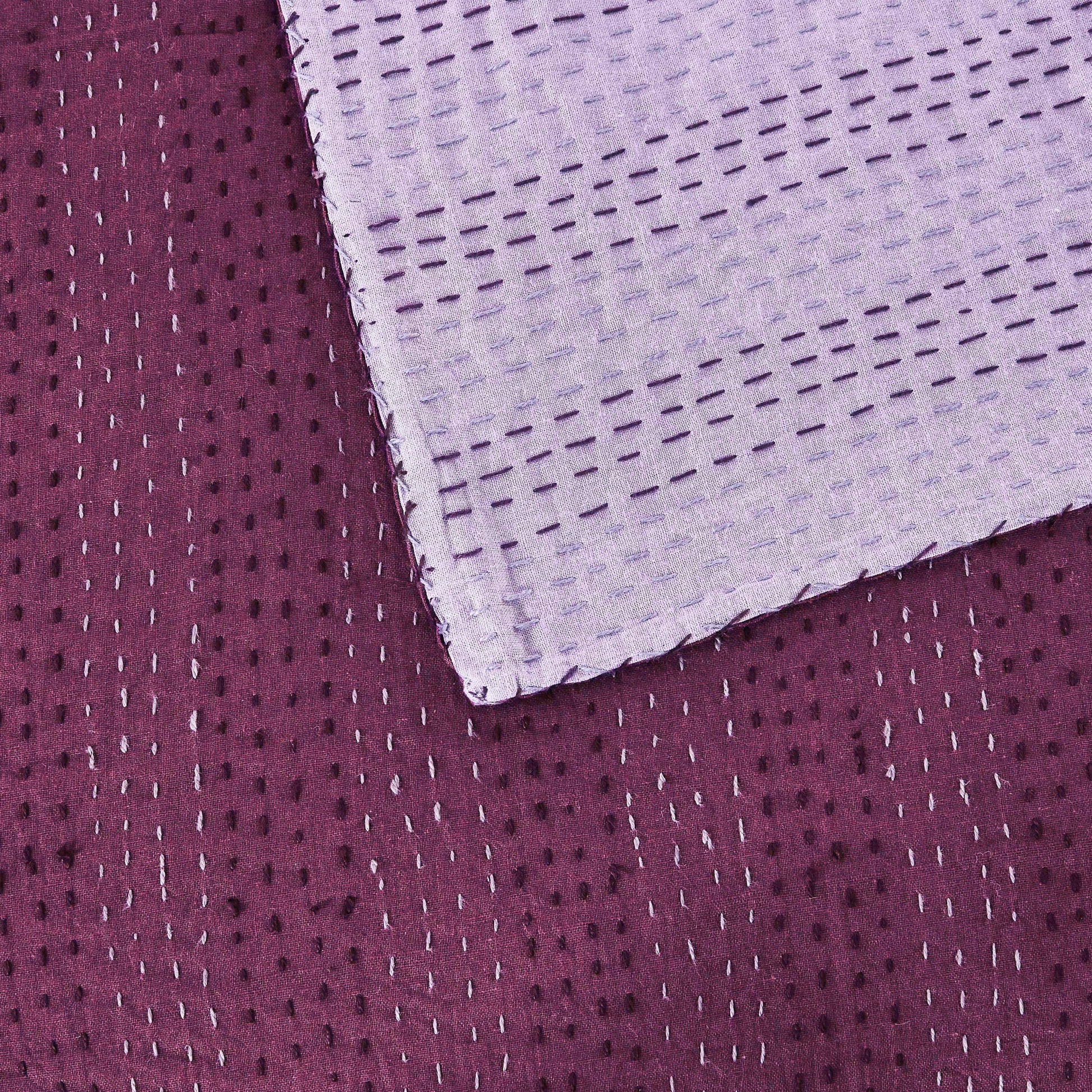 Our handmade coverlet features two coordinating colors. The cotton fabric is stitched by hand to create a unique, lightweight layer. Due to the handmade nature of this coverlet, variations will occur in the dying and stitching.