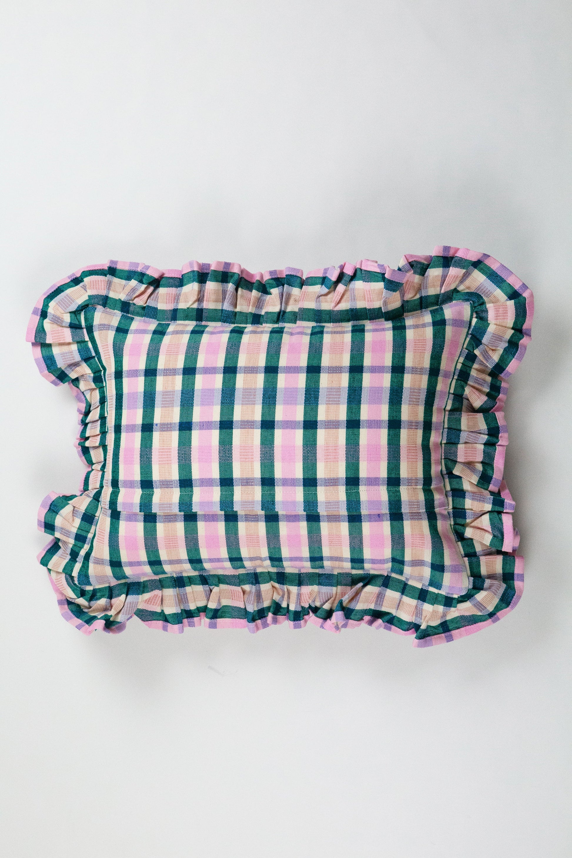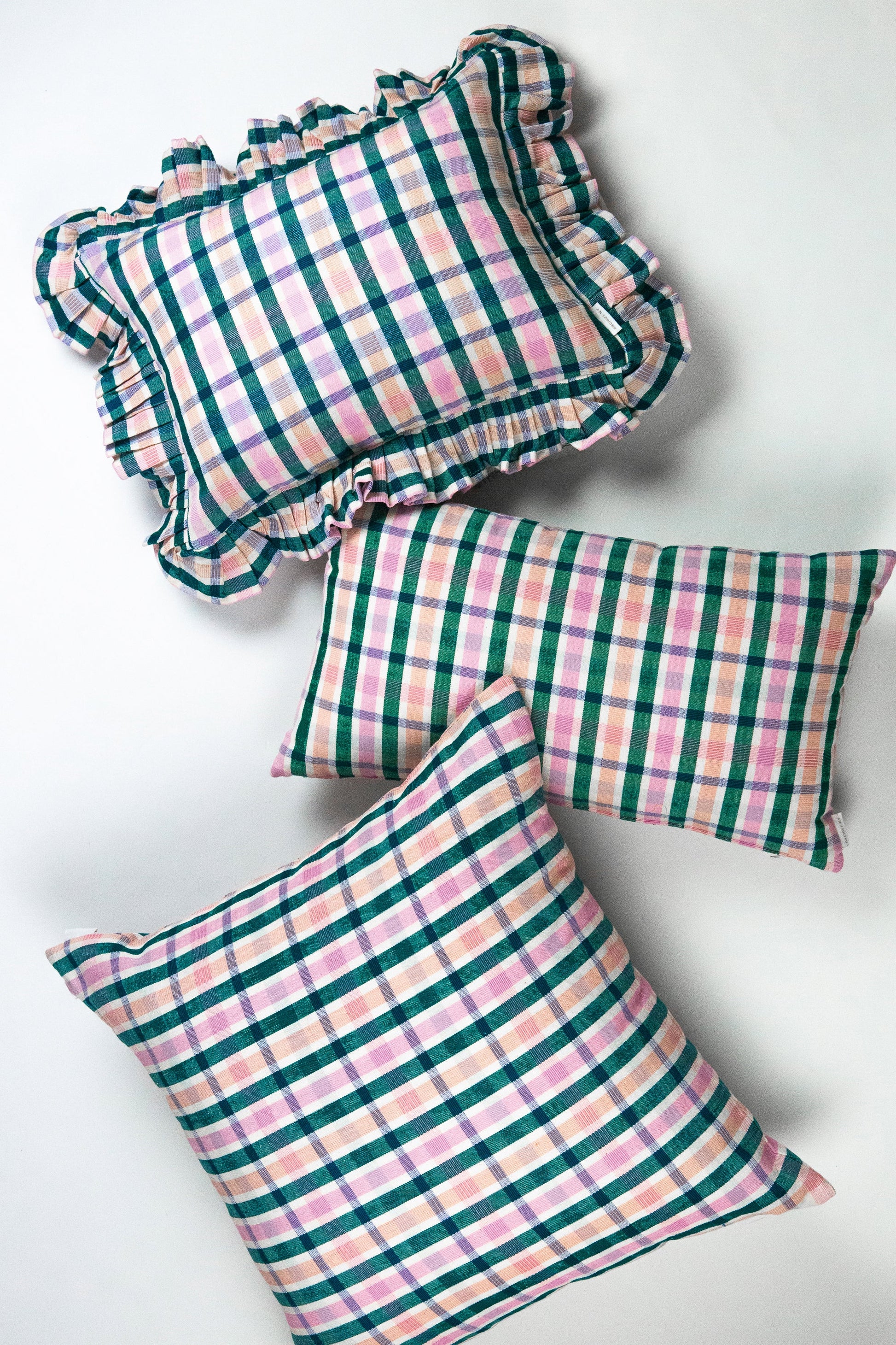 Our Lola ruffle plaid pillow is the perfect accent to add soft color and texture to any sofa, bedroom or accent chair. Stripes of light pink, peach, emerald and royal blue are woven together to create this brilliantly colorful piece. Ethically handwoven by artisans in Xela, Guatemala.