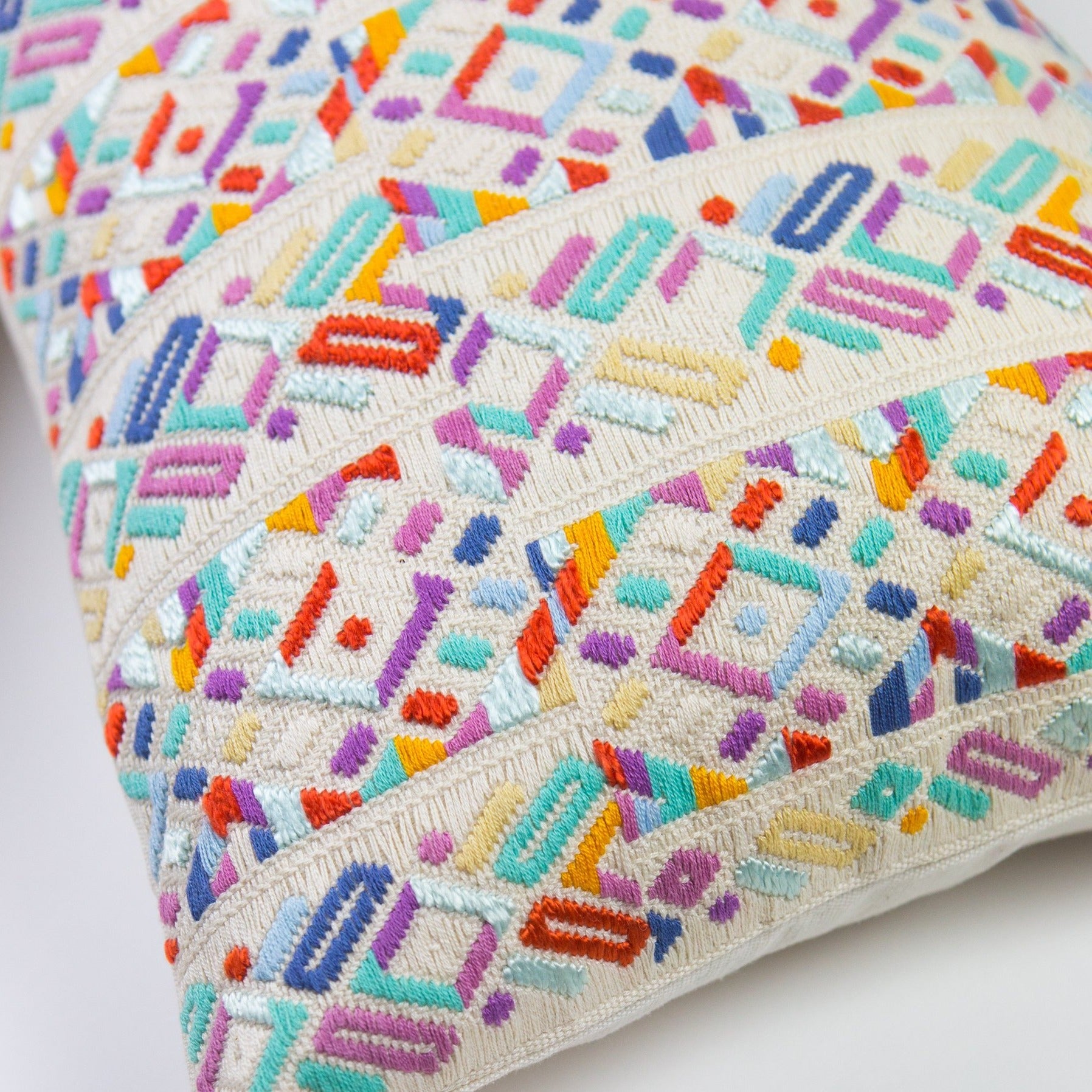 This textile was woven by an artisan from the village of Nahuala, Guatemala using a back-strap loom, a time honored method of weaving. The pattern represents one of Nahuala’s traditional geometric designs. This pillow was made in partnership with non-profit organization Maya Traditions.