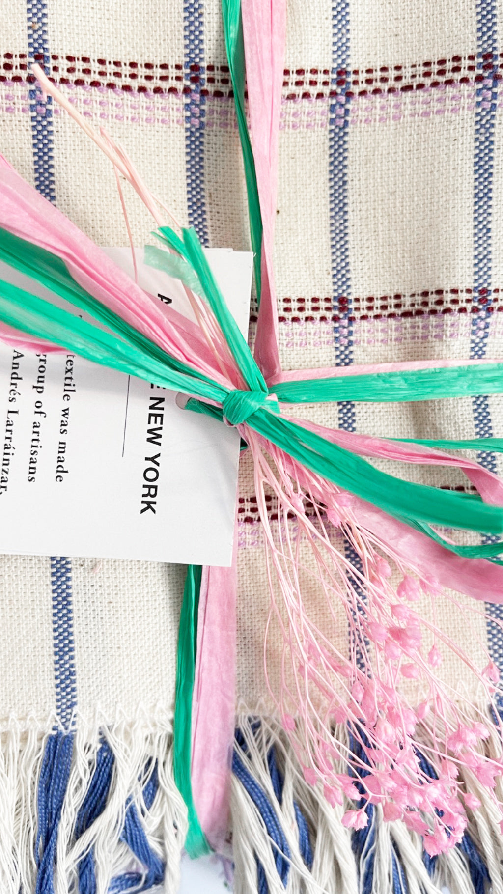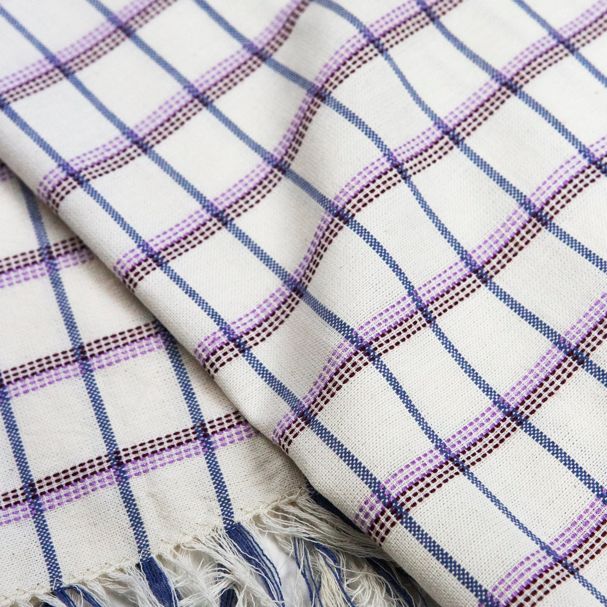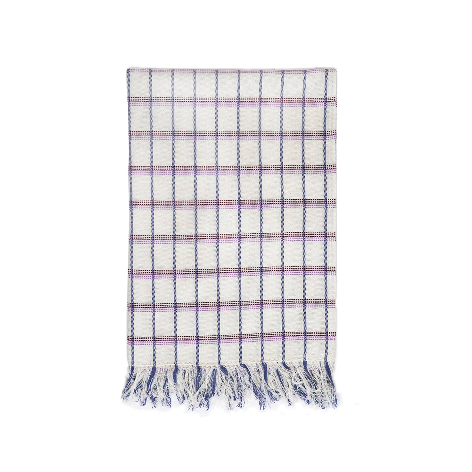 White plaid kitchen towel, ethically handwoven by artisans in Chiapas, Mexico on traditional footlooms. With hints of blue, burgundy and lilac, this updated classic plaid will be a lively addition to your kitchen or bathroom.