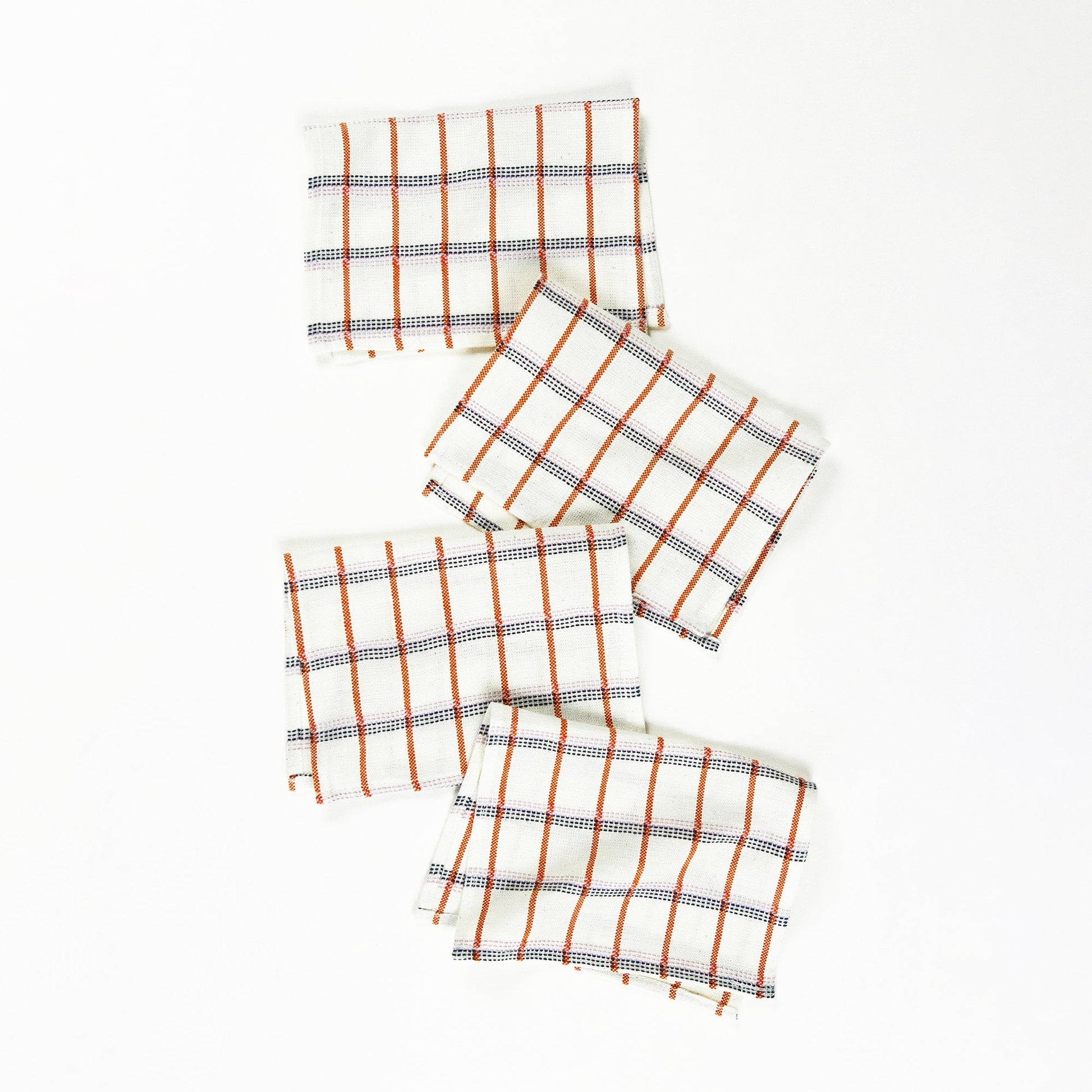 White plaid cocktail napkin set, ethically handwoven by artisans in Chiapas, Mexico on traditional footlooms. With hints of orange and lilac, this updated classic plaid will be a lively addition to any table setting or dinner party.