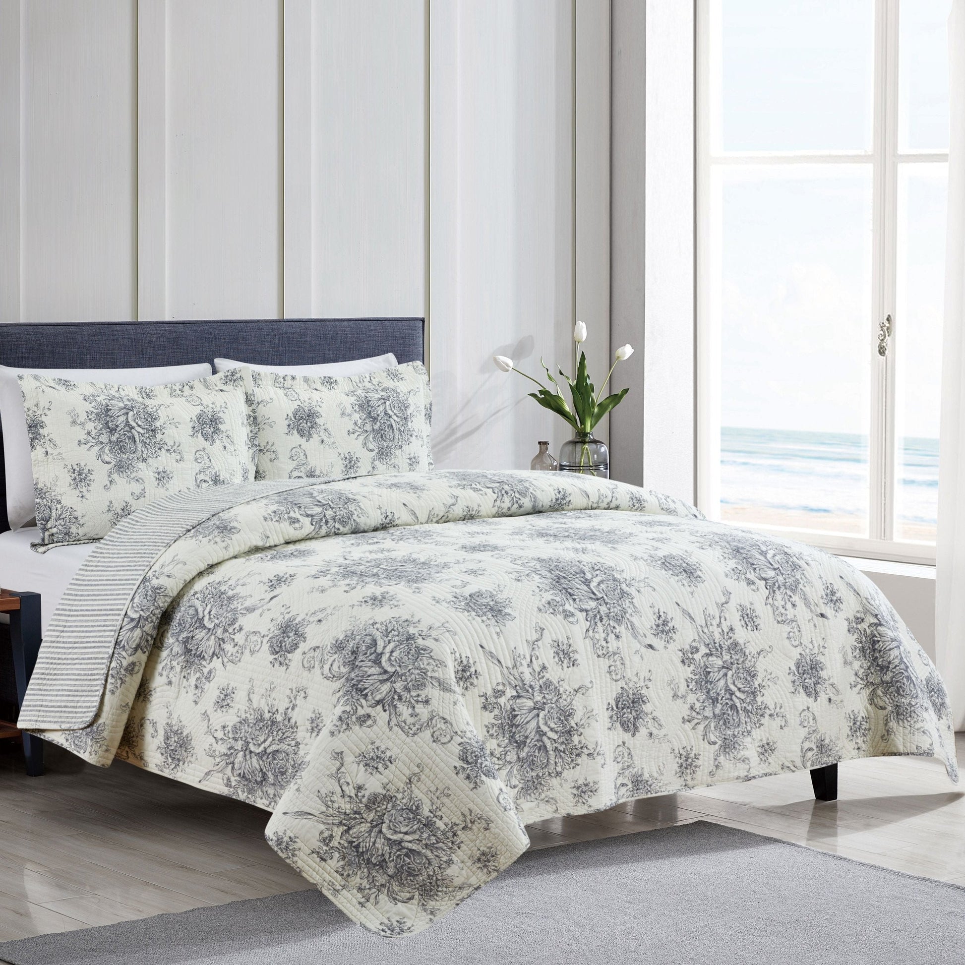 Crafted from a 100% cotton shell with a light cotton fill, this quilt set is warm, beautiful and made to last. Our classic Toile print reverses to Bamboo Stripes.