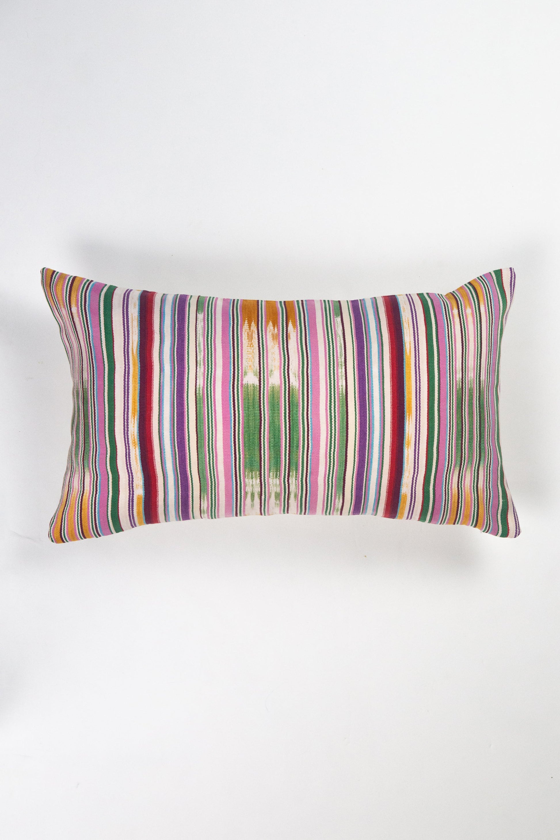 This vintage Guatemalan textile was originally a traditional skirt fabric. It is made from ikat dyed fabric with multi-colored stripes, then handwoven on a footloom.